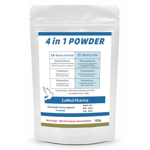 4 in 1 POWDER 100gr - amplio espectro - de CuMed Pharma, diseñado específicamente para la prevención y el tratamiento de las enfermedades más comunes en palomas y pájaros de jaula. Su fórmula avanzada combina Metronidazol y Furaltadona para garantizar una salud intestinal óptima y una desinfección por protozoas, máximo rendimiento.
