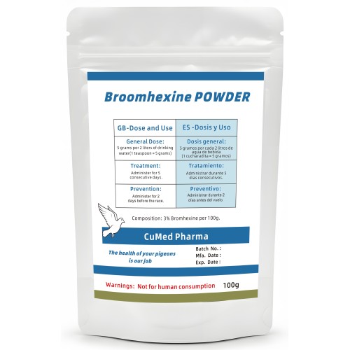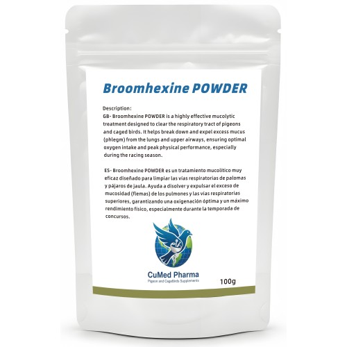 Broomhexine POWDER 100gr de CuMed Pharma, diseñado específicamente para limpiar las vías respiratorias de palomas y pájaros de jaula. Ayuda a disolver y expulsar el exceso de mucosidad (flemas) de los pulmones y las vías respiratorias superiores, garantizando una oxigenación óptima y un máximo rendimiento físico, especialmente durante la temporada de concursos.