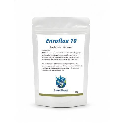 Enroflox 10 - 100gr es un antibiótico bactericida de amplio espectro de CuMed Pharma, formulado con Enrofloxacina al 10% en polvo soluble. Este potente agente antimicrobiano está diseñado específicamente para combatir infecciones graves en palomas y pájaros de jaula, ofreciendo una solución rápida y eficaz contra enfermedades que comprometen la salud y el rendimiento de las aves de competición.