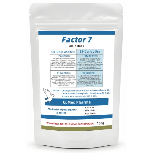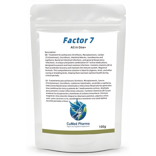 Factor 7 es una solución integral y magistral - todo en uno de CuMed Pharma diseñada como un tratamiento "todo en uno". Esta fórmula única combina 7 medicamentos activos con vitamina B12 para ofrecer una respuesta potente y completa contra las afecciones más comunes que afectan a palomas y aves de competición. Es el aliado ideal para mantener una salud óptima durante períodos críticos como las carreras o la cría, acelerando la recuperación y reforzando el sistema inmunitario.