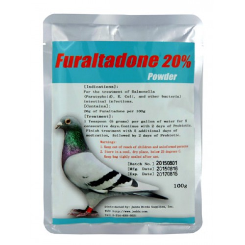 Furaltadone 20% es recomendado para el tratamiento de paratifoidea (salmonella), E-coli, Infecciones intestinales, en palomas y aves de toda especie. Salmonela se caracterisa por la rapida perdida de peso, la paralisis, mucosidad en los escrementos y la muerte repentina en los reproductores y pichones de corta edad.
