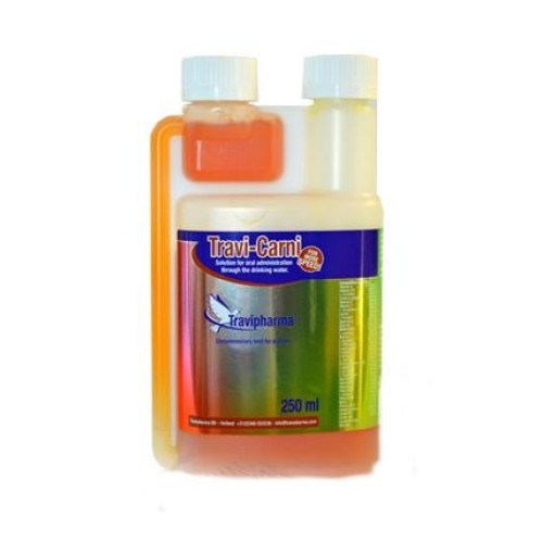 Travi-Carni 250ml de Travipharma es un suplemento nutricional para las palomas con L-carnitina, enriquecido con vitaminas y aminoácidos para mejorar el rendimiento durante la temporada de carreras.
