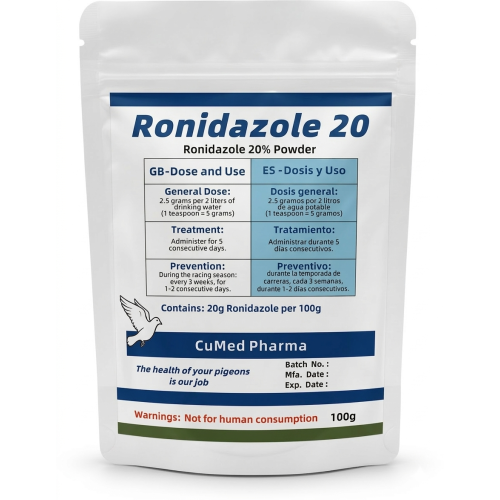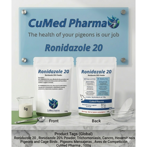 Ronidazole 20 100g de CuMed Pharma, formulado con Ronidazole al 20% en polvo soluble. Este producto de alta potencia está diseñado específicamente para combatir la enfermedad avanzada de la tricomoniasis y hexamitiasis (cancro), proporcionando una solución rápida y eficaz para la prevención y el tratamiento de estas infecciones protozoarias graves que comprometen la salud digestiva y la vitalidad de las aves de competición.