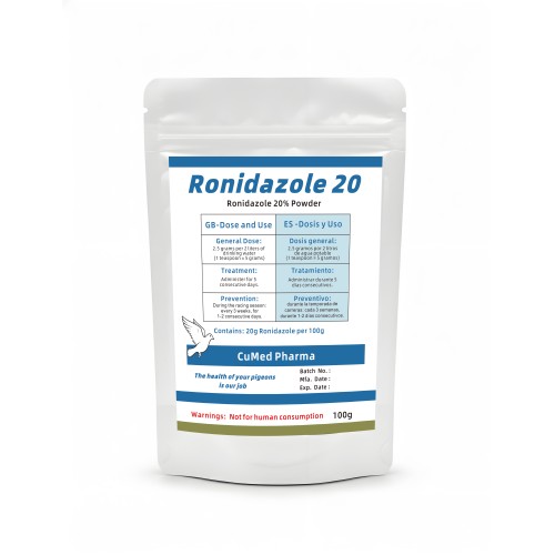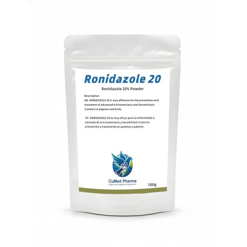 Ronidazole 20 100g de CuMed Pharma, formulado con Ronidazole al 20% en polvo soluble. Este producto de alta potencia está diseñado específicamente para combatir la enfermedad avanzada de la tricomoniasis y hexamitiasis (cancro), proporcionando una solución rápida y eficaz para la prevención y el tratamiento de estas infecciones protozoarias graves que comprometen la salud digestiva y la vitalidad de las aves de competición.