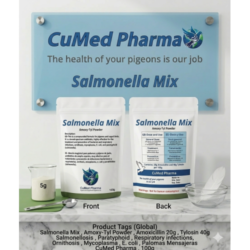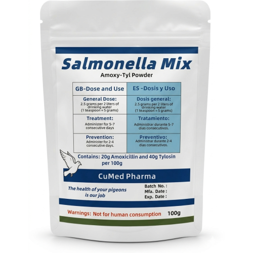 Salmonella Mix es una mezcla de antibióticos de amplio espectro de CuMed Pharma, formulada con Amoxicilina 20% y Tylosina 40%. Este polvo soluble combina potentes agentes antimicrobianos para ofrecer una solución integral en el tratamiento y prevención de infecciones bacterianas y respiratorias graves en palomas y pájaros de jaula.