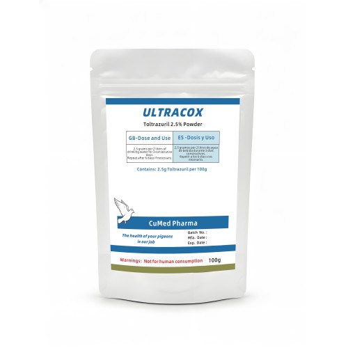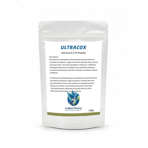 Buscar por enfermedad o ingrediente: Ultracox, Coccidiosis, Protozoos, Toltrazuril 2.5g, Diarrea Aviar, Endocox, baycox, Palomas, Pájaros de Jaula, pantacox, CuMed Pharma, Polvo Soluble, 100g