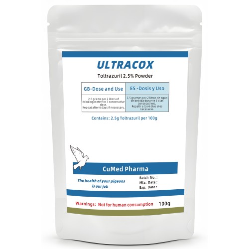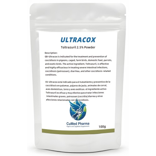 Buscar por enfermedad o ingrediente: Ultracox, Coccidiosis, Protozoos, Toltrazuril 2.5g, Diarrea Aviar, Endocox, baycox, Palomas, Pájaros de Jaula, pantacox, CuMed Pharma, Polvo Soluble, 100g